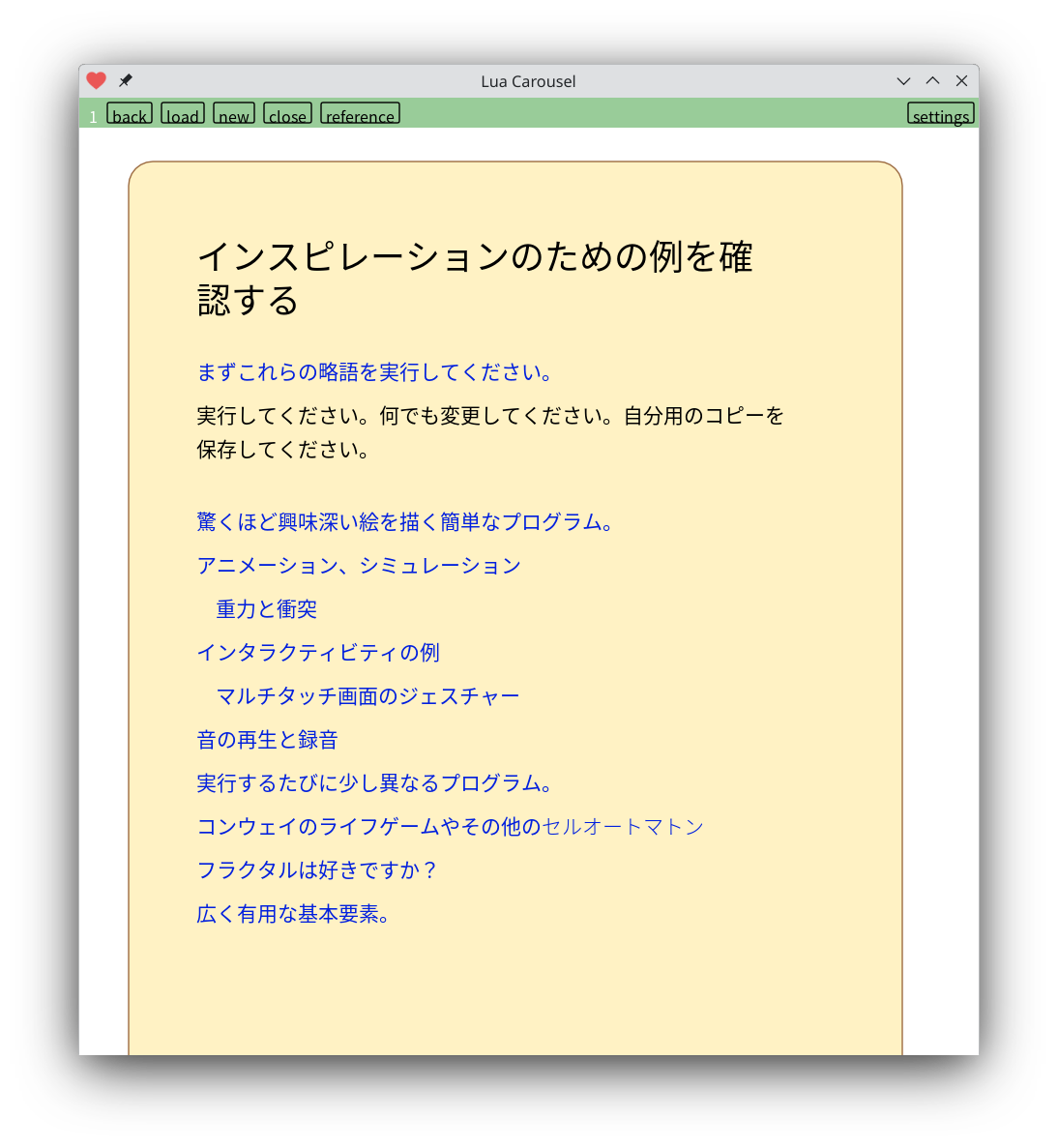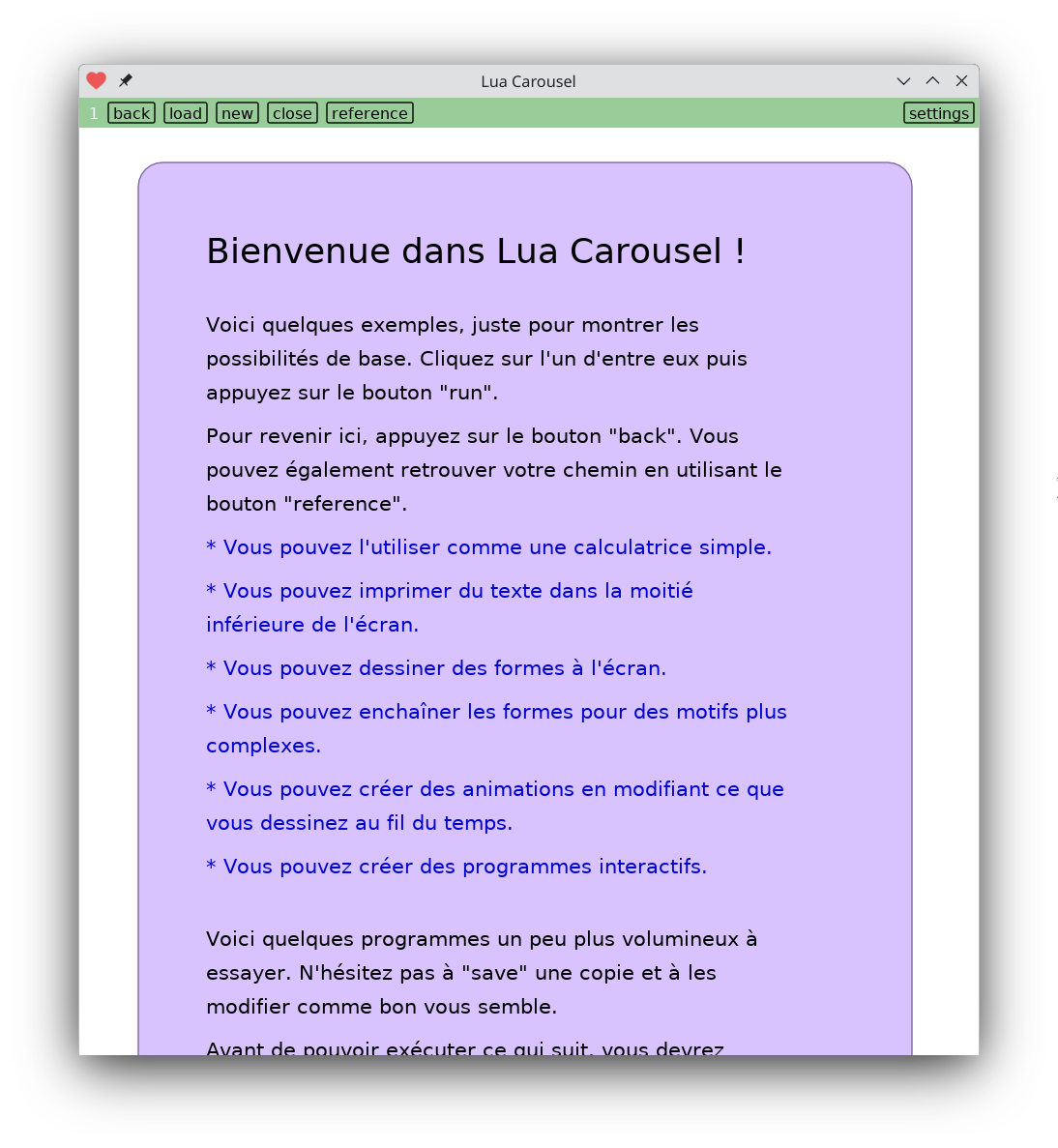 Lots of example programs you can run right from within it, clone and remix